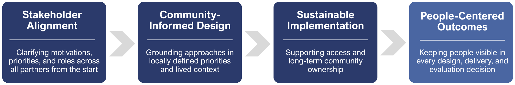 - Building toward handoff — so that when outside support steps back, the community, partners, and systems that remain are equipped to lead